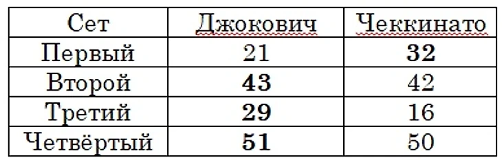 Во-вторых, даже несмотря на фантастическую силу Чеккинато – а играл он, как мы выяснили, явно сильнее Шварцмана, уровня которого хватило для того, чтобы вести с сетом и брейком у «Короля грунта» – Джокович, по сути, выиграл матч. Действительно, в трёх партиях из четырёх он одержал победу по числу завоёванных очков (см. таблицу 2).