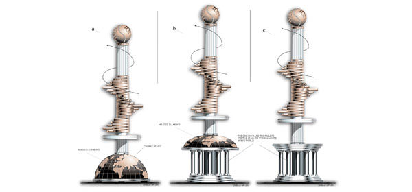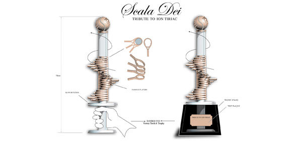 Чтобы начать процесс создания, Роланд поехал в Испанию для вдохновения. Он арендовал замок высоко в горах Каталана и начал рисовать эскизы. В той же маленькой деревне был винный завод, где Роланд обнаружил необыкновенное испанское вино, которое называется "Scala Dei" - буквальный перевод - Лестница в небо. Концепция лестницы на небо очаровала Роланда и стала его вдохновением для создания дизайна трофея, лестница в небо является его "неофициальным" названием. Роланд Итен говорил: Мне нужно было найти конструктивное решение, чтобы объеденить всех великих теннисистов . Победа на турнире Большого шлема в 1970 году требовала других навыков, чем сегодня, не лучше или хуже, просто других. И каждый из теннисистов, которые вошли в историю спорта, от Макинроя до Уильямс, от Федерера и Надаля, до Маргарет Смит, обладают своим собственным индивидуальным мастерством и стилем. Так что я создал небольшую колонку, и обернул вокруг нее маленькие теннисные ракетки, каждая из которых с именем игрока, который выигрывал турнир Большого Шлема. 32 ракетки составляют "лестницу", и каждый шаг также важен, как другой, потому что, если один шаг отсутствует, лестница не полная ". На вершине есть золотой теннисный мяч с именем Иона Тириака на нем. Из золота и украшенный бриллиантами, это необычный трофей. Это настоящая жемчужина, и он заслуживает восхищения.