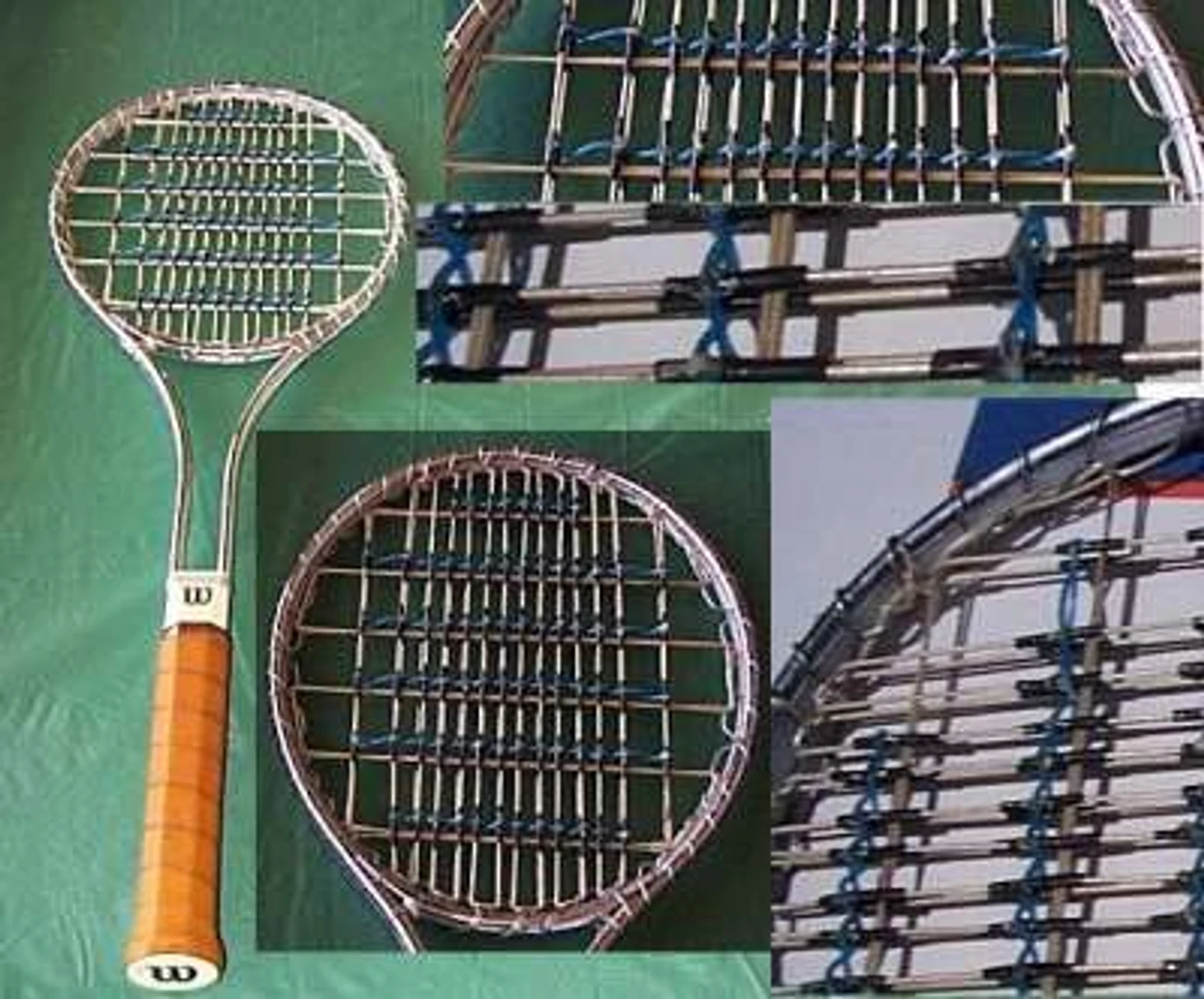 Но самой революционной системой натяжки струн была безусловно спагетти-натяжка, изобретенная в 70-х годах немецким инженер-садоводом Вернером Фишером и впоследствии названная в честь известного блюда, на которое была похожа внешне, и запрещенная в 1978 году. Что она из себя представляла показано на рисунке. В ней было только пять или шесть поперечных струн (двойных) и они не переплетались с продольными струнами. Продольные струны были связаны вместе около поперечных струн тонкими лесками вокруг каждой продольной струны таким образом, чтобы все продольные струны двигались вместе. Было два набора продольных струн, по одному на каждую сторону ракетки, поперечные струны были расположены между двумя продольными. Таким образом, всего три отдельных слоя струн. В точках пересечения продольных и поперечных струн располагались отрезки пластиковых спагетти-образных трубок, надетых на продольные струны для снижения трения. Как это работало стало более-менее ясно только недавно, после изучения тангенциального взамодействия мяча со струнами в результате экспериментов, выполненных с помощью высокоскоростной видеосъемки (10000 фреймов в сек.) в 2005-2007 годах. Мяч, попадая на струны под углом, начинал сдвигать всю связку поперечных струн, разгоняя ее и тормозясь сам, закручиваясь за счет силы трения скольжения. Когда тангенциальная скорость мяча сравнивалась со скоростью связки струн, он захватывался ими ( происходило сцепления как колеса с дорогой), линейные скорости поверхности мяча и поверхности связки струн сравнивались и мяч катился по поверхности струн без скольжения, продолжая растягивать их в сторону. Возвратная сила растянутых струн при этом возрастала, достигая максимального значения, когда нормальная и тангециальные скорости мяча снижались до нуля. Коэффициент трения покоя между мячом и струнами был достаточно большой из-за большого расстояния между струнами, а также из-за трубок-спагетти и лесок. Это позволяло мячу не выходить из сцепления со струнами. Когда мяч начинал отскакивать от струнной поверхности в нормальном направлении, тангенциально смещенные струны возвращались на место и придавали находящемуся в сцеплениии мячу дополнительное вращение. Иначе говоря, спагетти струны и мяч действовали как фрикционный редуктор, придавая мячу максимально возможное вращение на фазе сцепления во время отскока. На языке физики такую систему можно назвать натяжкой с большой тангенциальной подвижностью струн. К сожалению нет доступных данных по измерению каких либо параметров спагетти ракеток. Приблизительная оценка тангенциального коэффициента восстановления скорости дает величину ех = 0.6-0.7. Кажушийся тангенцияльный коэффициент восстановления скорости (ракетка в руке) конечно меньше - примерно 0,3-0,4. Но и это очень много. Современные ракетки с полиэстерными струнами дают максимум 0.15. Чтобы оценить разницу, можно привести гипотетический пример. Самый сильный топспин закручивает Надаль – 4500 об/мин. Современной ракеткой со спагетти наряжкой он смог бы достичь 6500 об/мин. Для сравнения, максимальная скорость топспина в пинг-понге – 8000 об/мин (диаметр 40 мм, вес шарика 2,7 г ; диаметр теннисного мяча 66 мм, вес 59 г). У спагетти натяжки были свои недостатки, пожалуй главным из которых являлась непредсказуемость отскока. Сама по себе натя