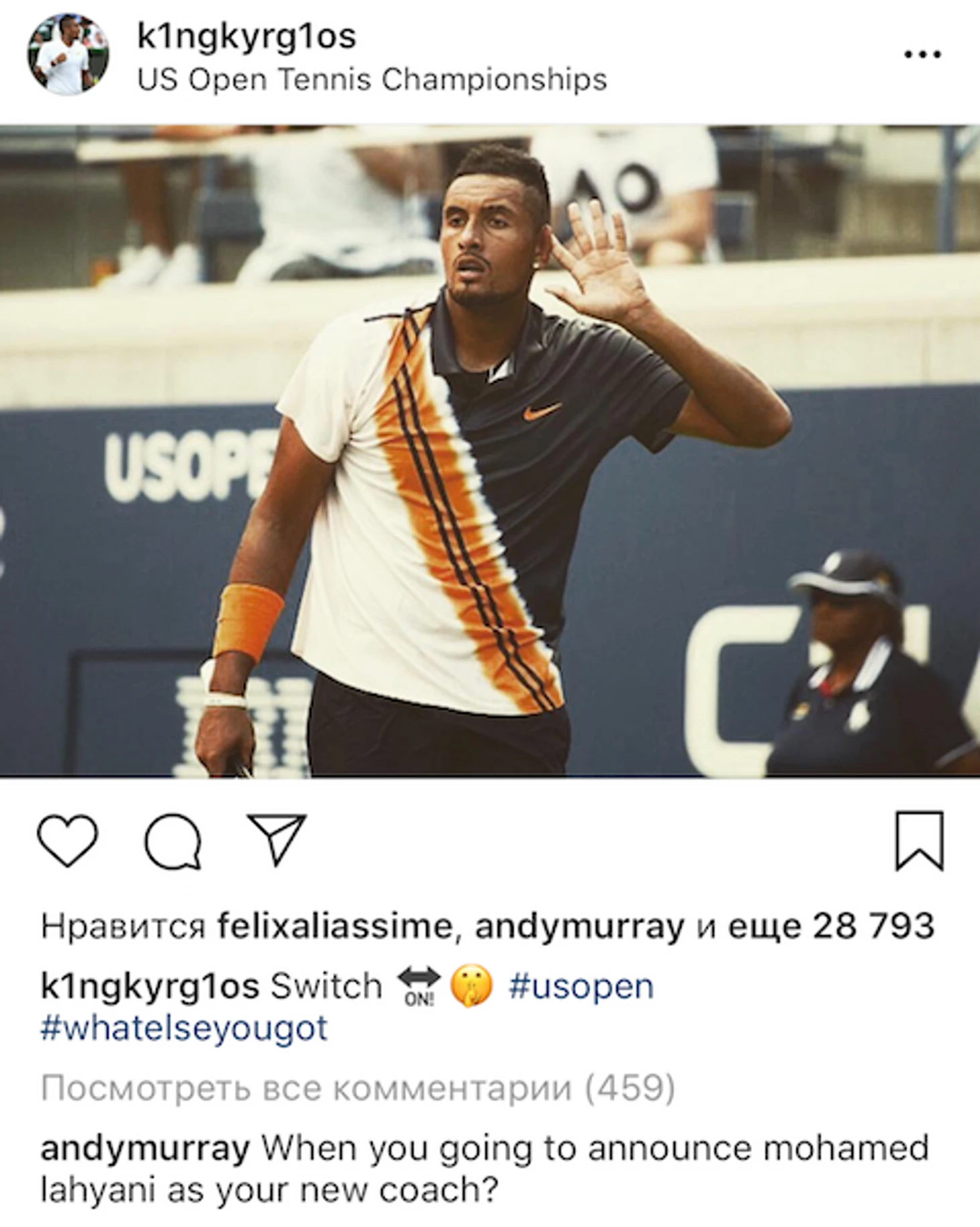 Хотя нет. Вопрос закрыл король инстаграма Энди Маррей, подписавший пост Кириоса о матче словами: «Ты когда объявишь Мохамеда Лайани как своего нового тренера?».