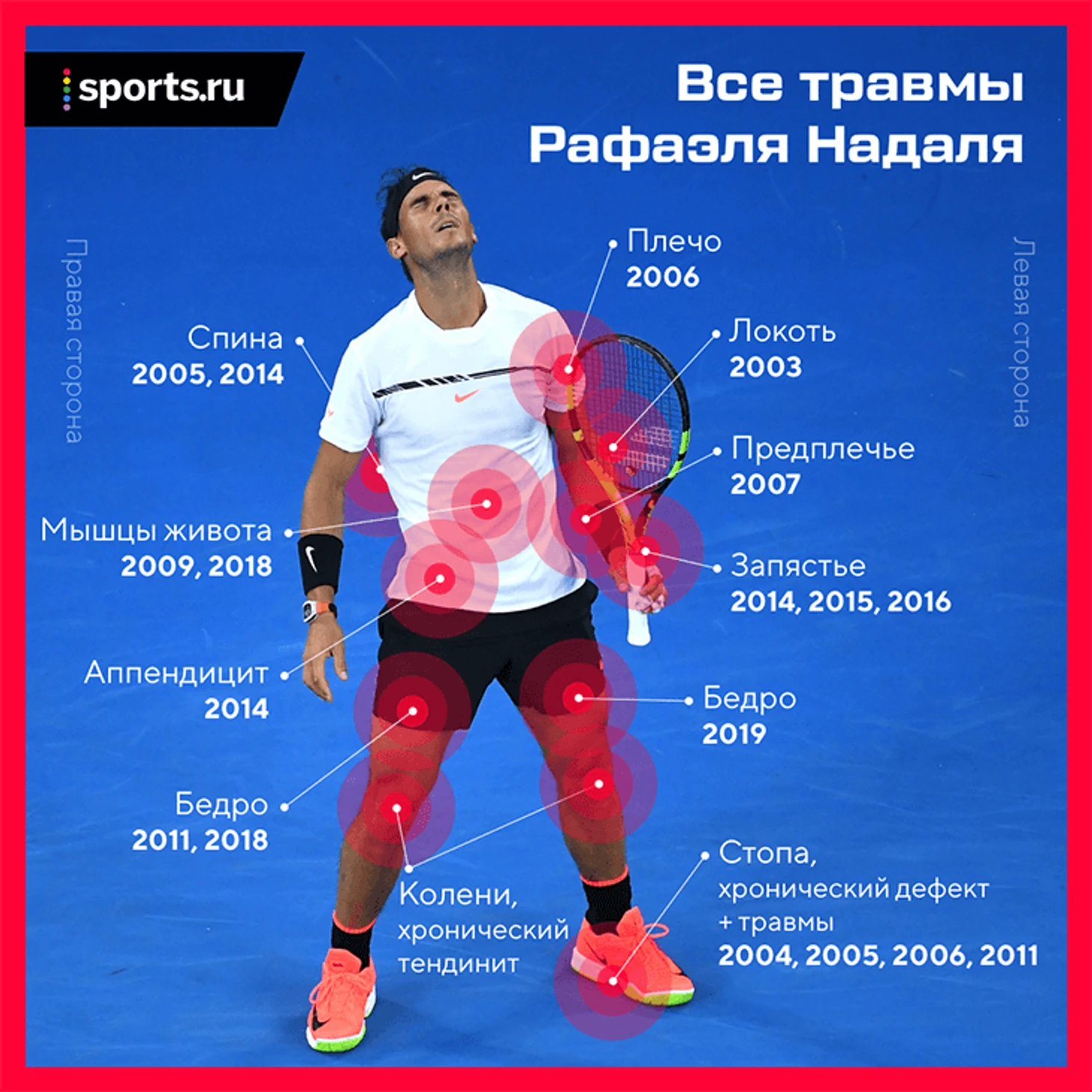 И смотрите сами – мы насчитали у Рафы 12 частей тела, из-за повреждений которых он пропускал разные соревнования.