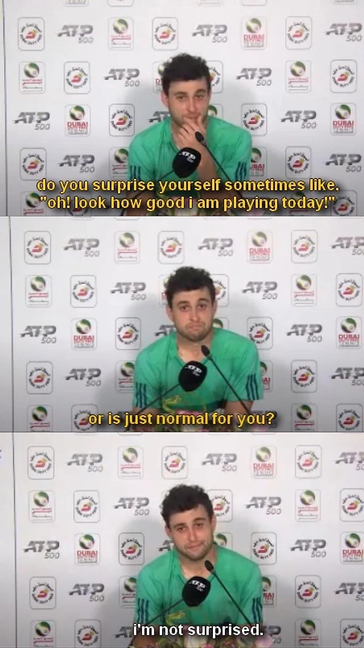 Еще теннис веселился от немногословности и общей сдержанности Карацева (справедливости ради, свойственной почти всем игрокам, внезапно оказавшимся в центре внимания):