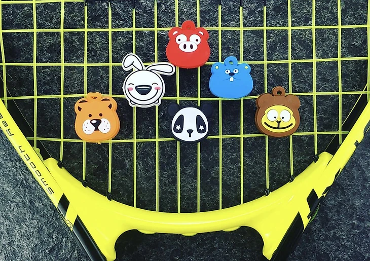 Пуговичные виброгасители часто производятся в форме логотипов, значков с надписями или эмодзи, среди них иногда отдельно выделяют гаситель «Пита Сампраса» – в виде бублика.