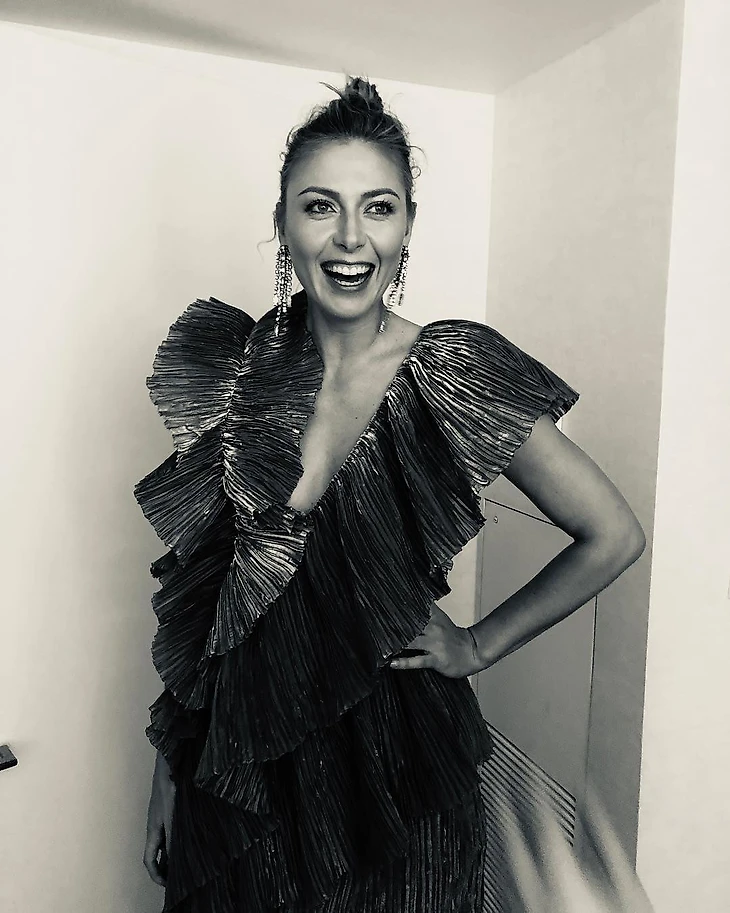 На вечере фонда Элтона Джона по борьбе со СПИДом, где бойфренд Шараповой Александр Джилкс был аукционистом, Мария была одета в длинное кастомное черное платье панельного дизайна от David Koma (интерпретацию подиумного лука из коллекции весна/лето-19), навевающее воспоминания о ее рисковом выходе в полупрозрачном кружеве в 2013-м.
