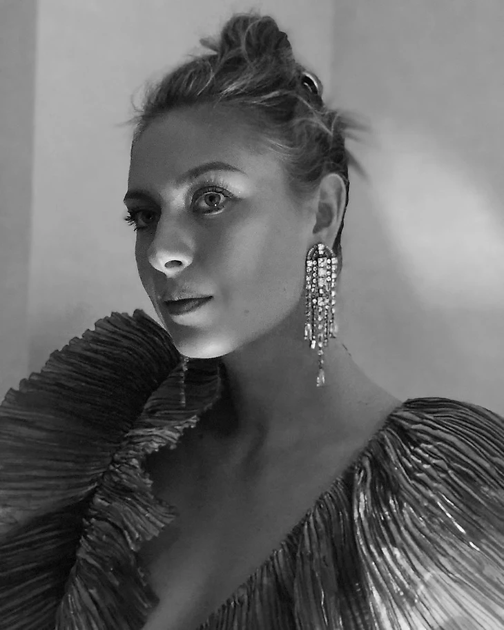 Образ Шараповой был взят из лукбука французского дома Lanvin: короткое асимметричное коктейльное платье из шифона «лунного цвета» ($4 995) и длинные серьги ($1 180), – и дополнен минималистичными черными босоножками с расшитой пяткой.
