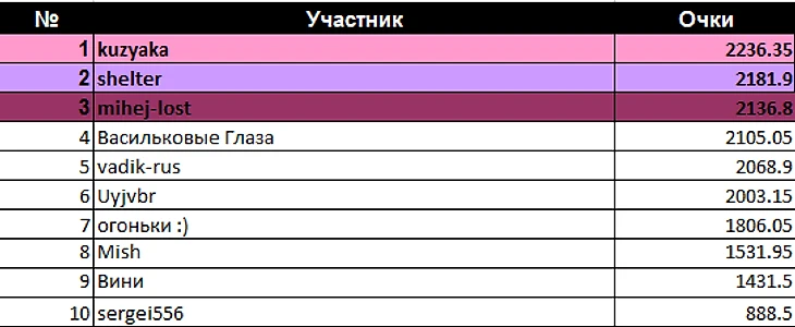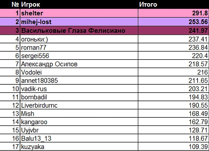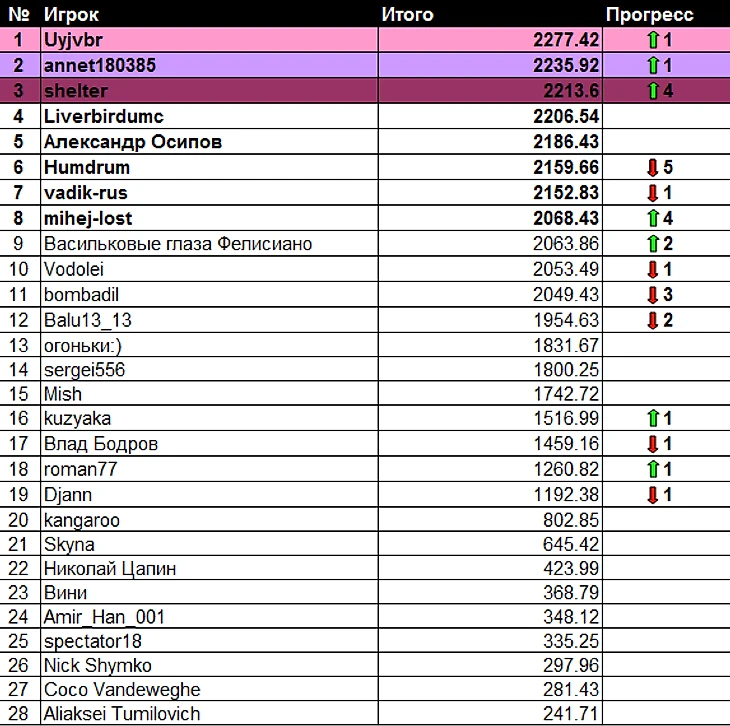 "Прогресс" недели и самый большой подьем вверх на 4 позиций был сразу у двух игроков у чемпиона этой недели shelter и mihej-lost