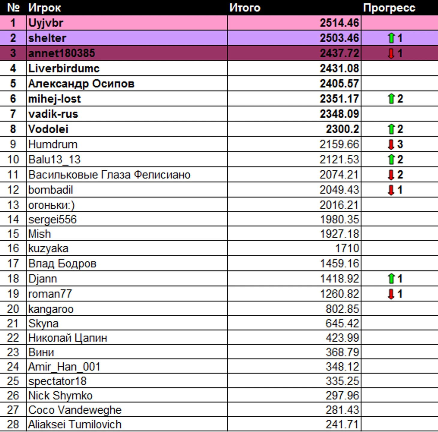 "Прогресс" недели и самый большой подьем вверх на 2 позиций был сразу у троих игроков у mihej-lost, Vodolei и Balu13_13