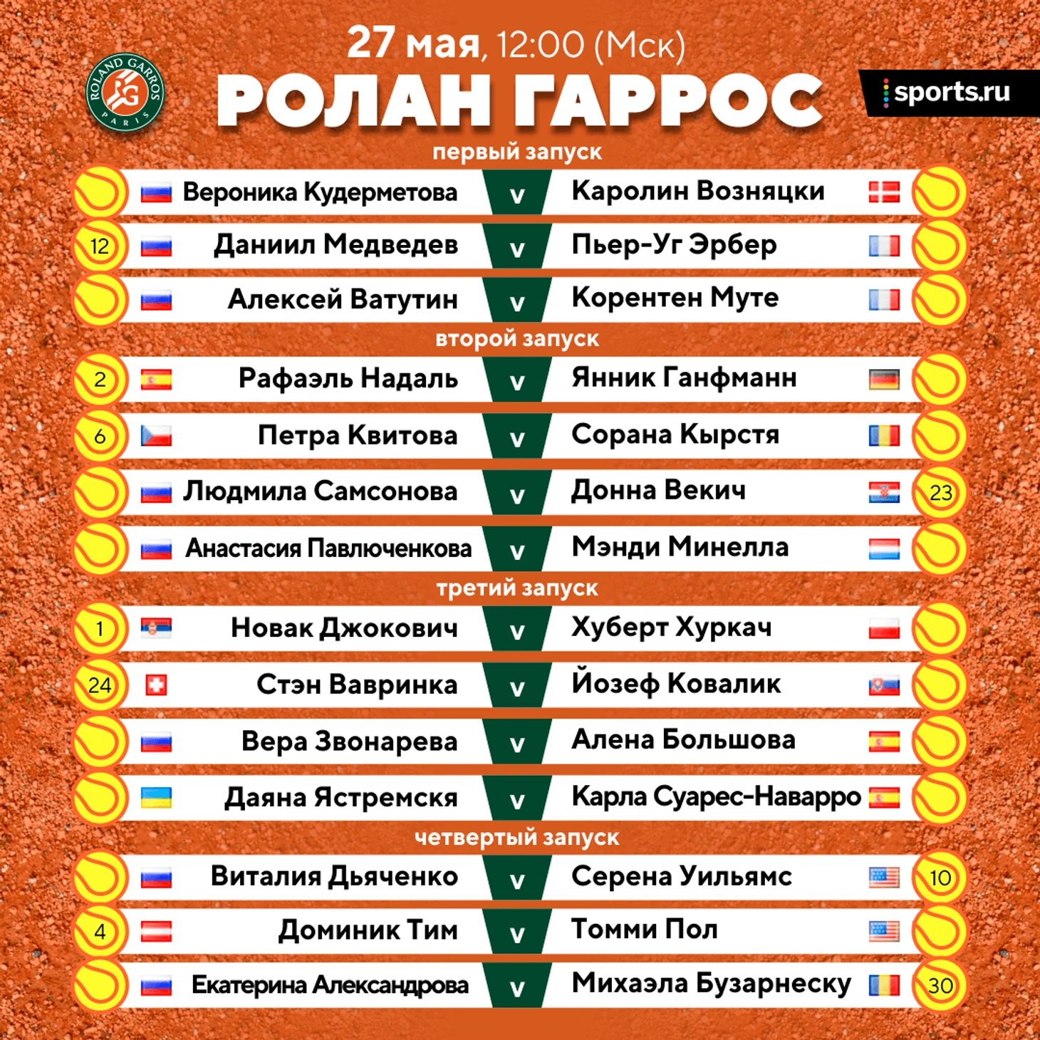 Дьяченко против Серены, Джокович, Надаль, Медведев. Главные матчи «Ролан Гаррос» – в этом посте