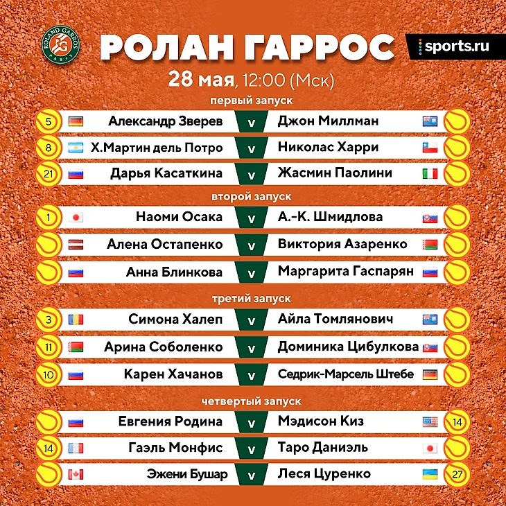 Старт Хачанова, Касаткиной, Зверева и Халеп, заруба Азаренко с Остапенко. Главные матчи вторника на «Ролан Гаррос»