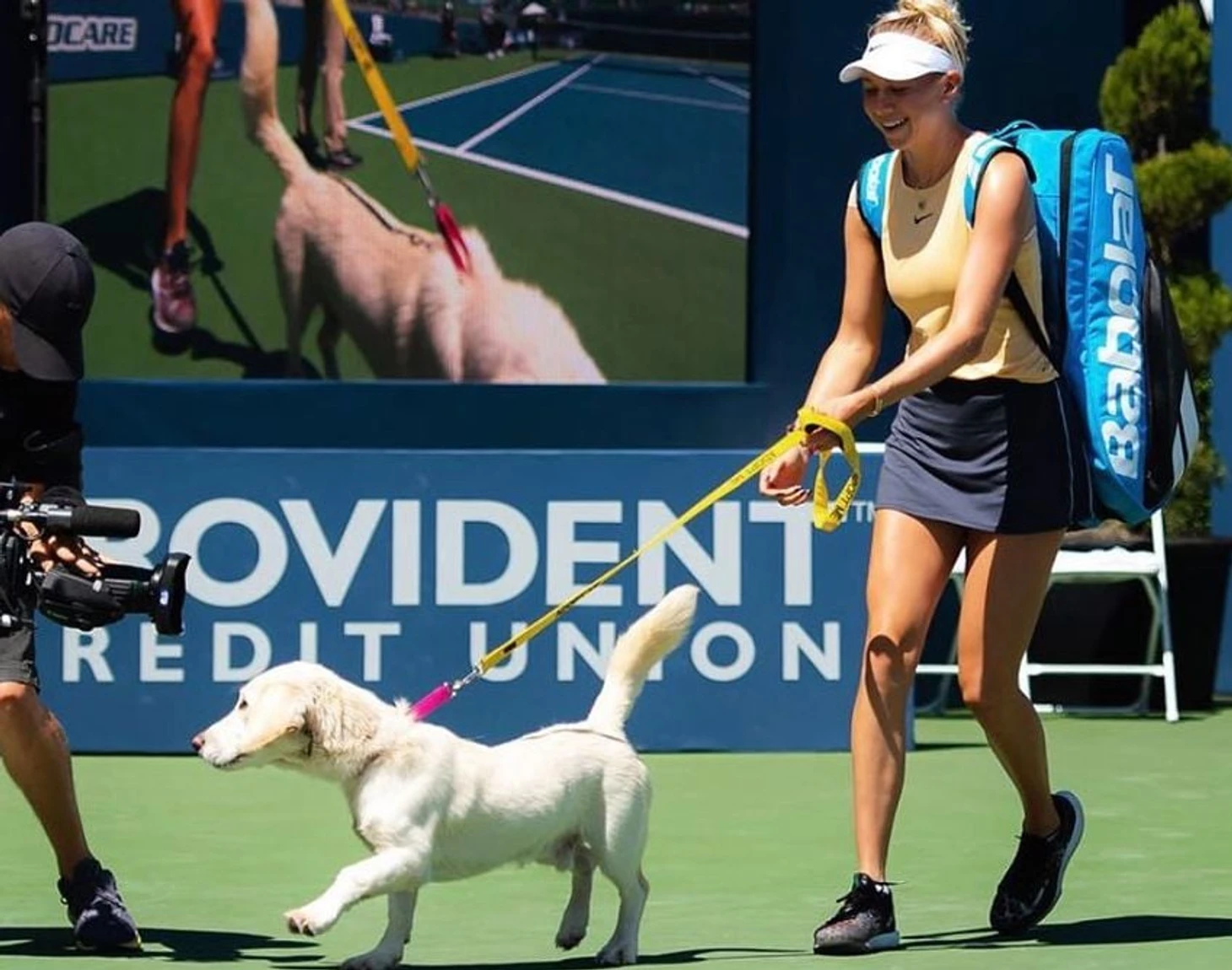 Собачья тема играла и на противоположном побережье США – в Вашингтоне на церемонию награждения вышел один из трех псов новой чемпионки турнира Джессики Пегулы: