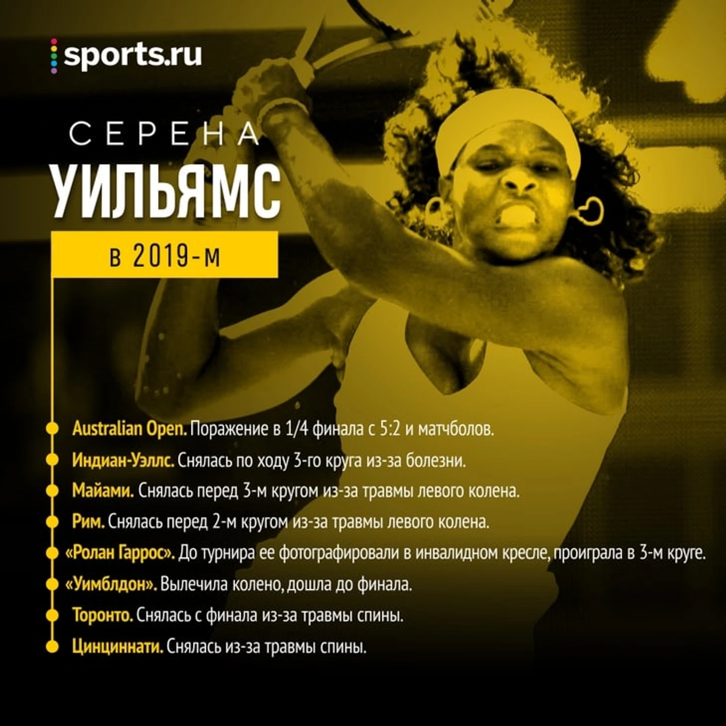 Кажется, в середине прошлого сезона вернувшись после тяжелых родов и декрета, 37-летняя Серена столкнулась с теми же проблемами, что и Мария Шарапова после дисквалификации за мельдоний: организм просто не справляется с турнирными нагрузками, и это выливается в постоянные травмы.