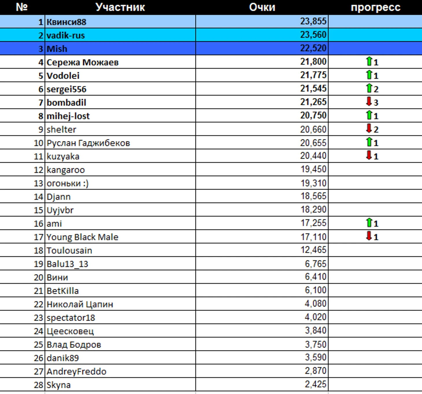 На этой неделе самый результативный скачок вверх на 2 пункта совершил чемпион этой недели sergei556. Самое большое падение вниз случилось у bombadil -3 позиций .
