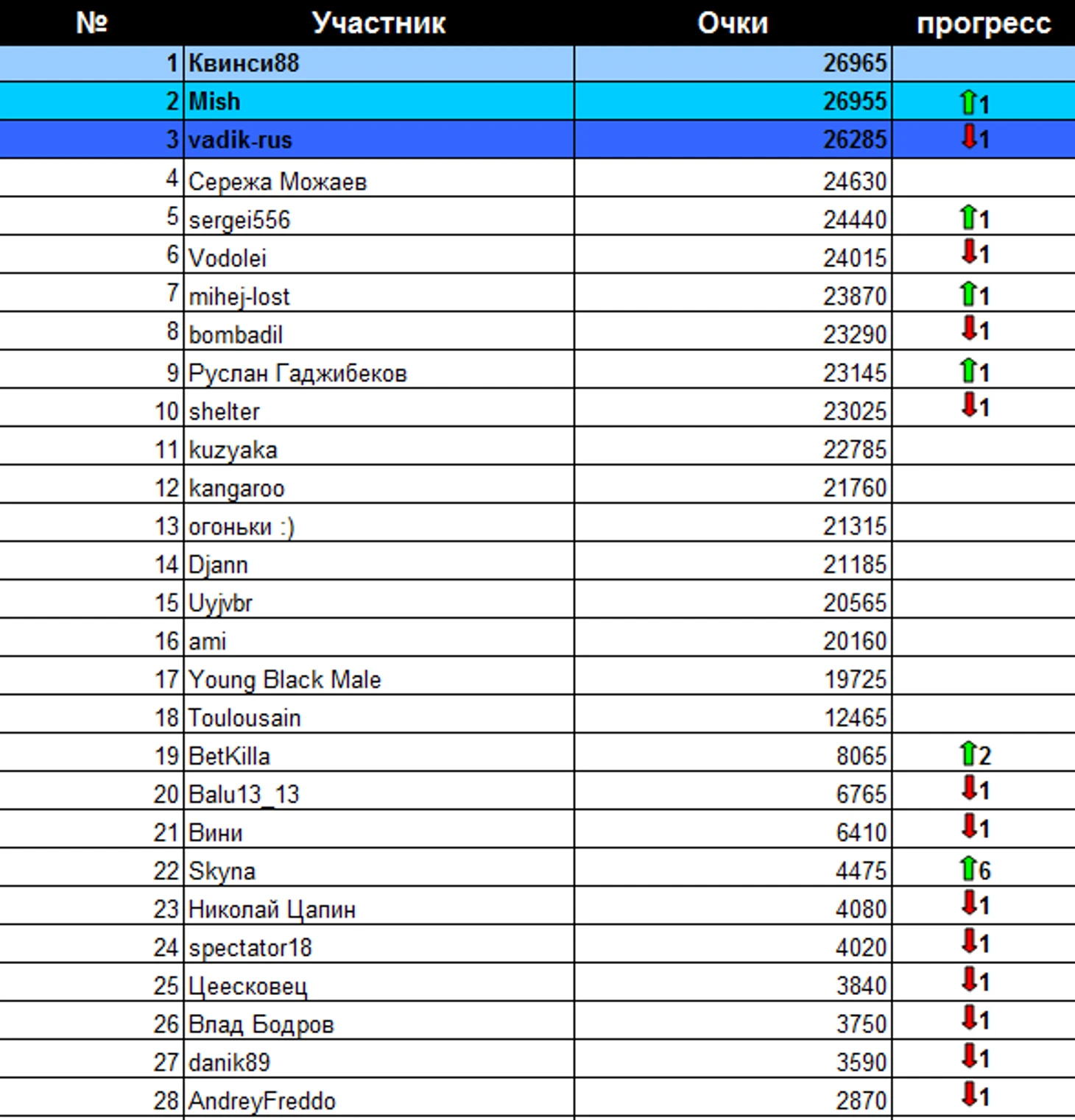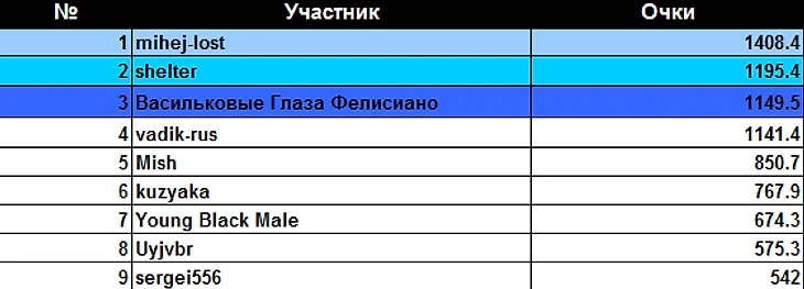 На этой недели самый большой подьем вверх на 6 позиций был у Skyna каторый впервый за дольгое время собрал команду так же на этой недели много не больших падений вниз на 1 строчку сразу у 12 игроков.
