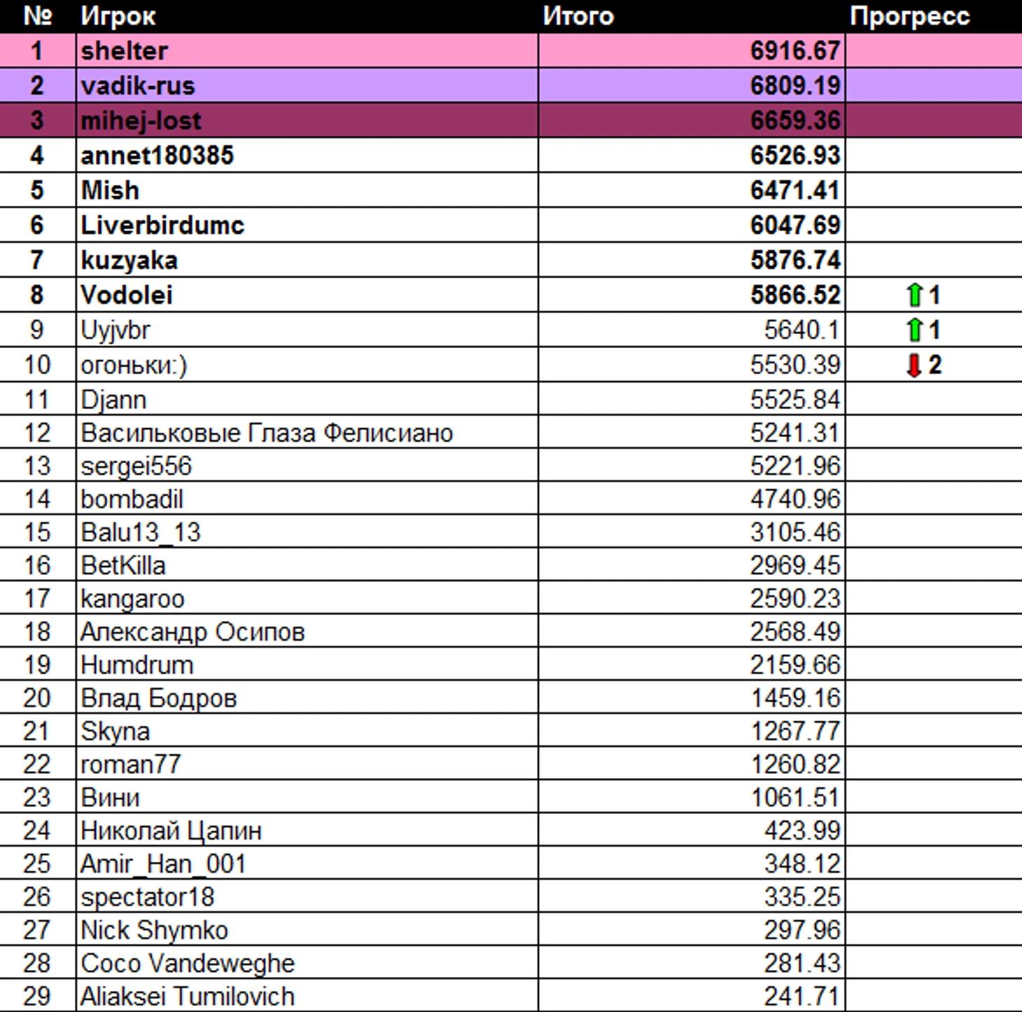 На этой недели в чемпионской гонке было всего три измениния Vodolei и Uyjvbr поднялись на одну позицию что Vodolei это позволело в топ 8. огоньки:) в свою очередь опустился на две позиций и выпал из топ 8.