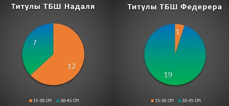 На основе вышеизложенного можно констатировать, что территория Федерера представлена сразу тремя ТБШ, а территория Надаля – лишь одним, а значит универсализм теннисиста сводится к балансу между грунтом и всем остальным. Наконец, определим разносторонность титулов Надаля и Федерера на круговой диаграмме.