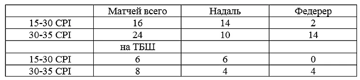 Испанец выиграл у швейцарца 24 из 40 матчей в целом и 10 из 14 на турнирах «Большого шлема». Значимость этого факта обычно занижается упоминанием того, что огромная доля поединков прошла на удобном для Надаля грунте, но, поскольку в прошлом пункте было доказано, что трава и хард очень близки друг к другу и крайне далеки от грунта, становится очевидно, что никакого перекоса в пользу Рафаэля нет. Напротив, большинство поединков прошли на удобной для Федерера территории, что, впрочем, не спасло швейцарца.