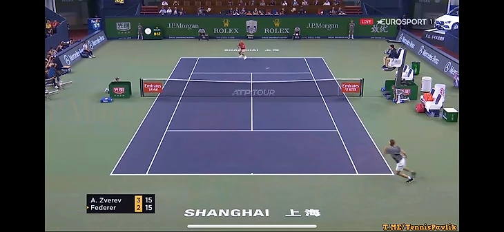 Роджер решает сыграть в середину прямо на Зверева. Если играть в середину , нужно играть очень плоско в самые ноги , чтобы сопернику было очень неудобно сыграть такой мяч, но лучше все равно играть в угол. При игре слета у соперника очень мало времени на хороший подход и плотный удар, а когда мяч послан в угол, хорошо сыграть крайне сложно.