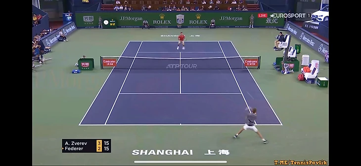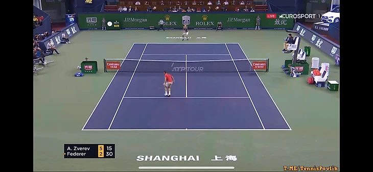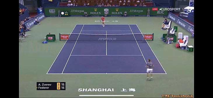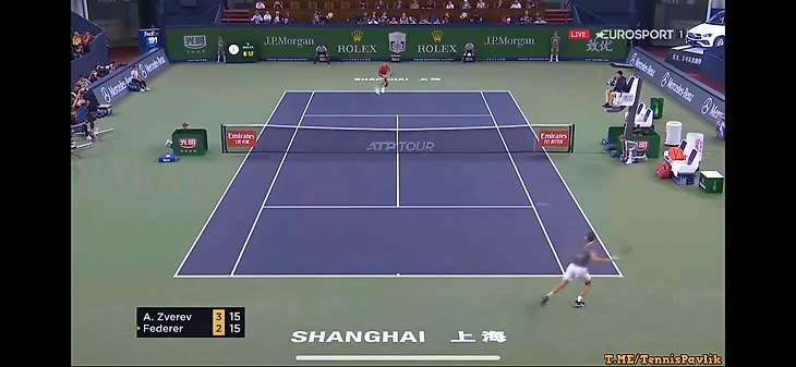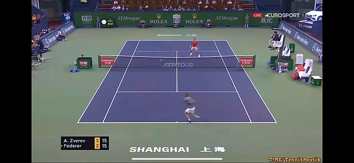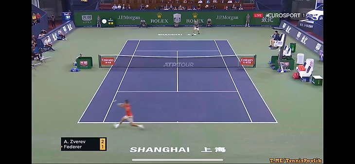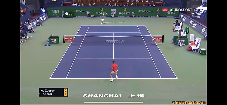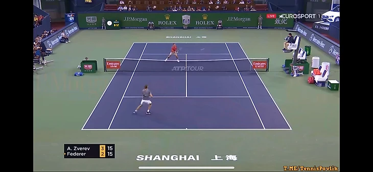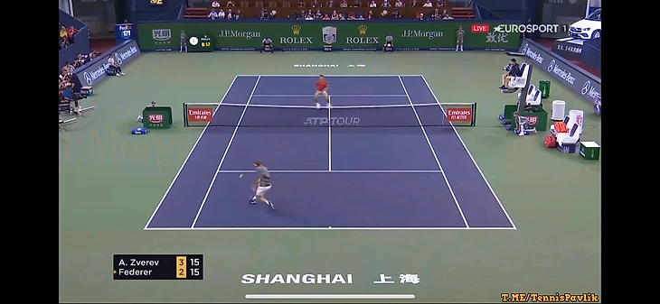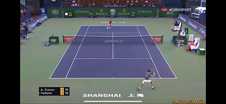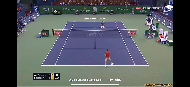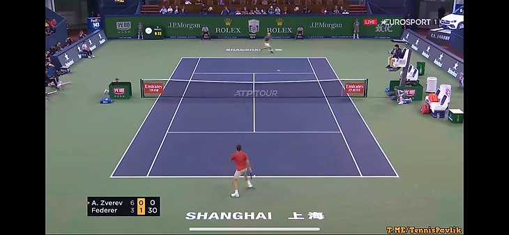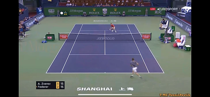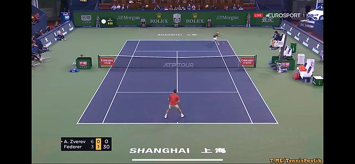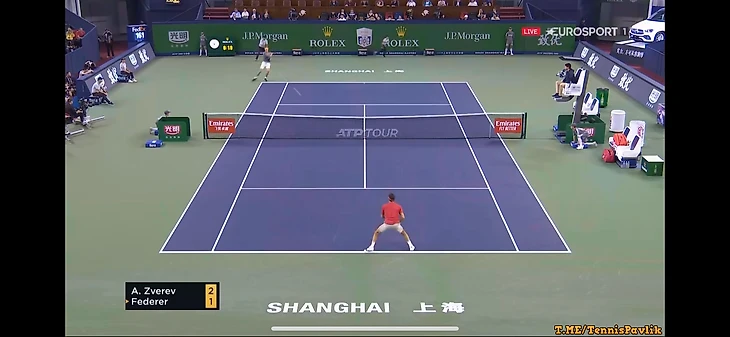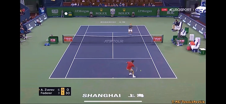 Мяч летит неплохо, Зверев вынужден догонять неудобный мяч. У Роджера две опции - бежать к сетке, или ждать , что сделает Зверев, при этом находясь в полной боевой готовности на задней линии. Вторая опция , по правде говоря, достаточно плохая, тут явно нужно бежать с сетке и заканчивать розыгрыш ударом слёта.
