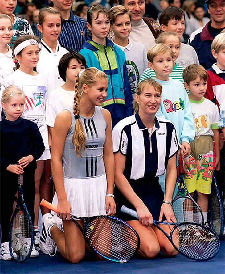 «Первая ракетка мира Штеффи Граф приехала в Москву на 30 часов (со своим фотоаппаратом), чтобы сыграть выставочный сет с будущей звездой, 15-летней Анной Курниковой. Граф вела 5:2, но потеряла концентрацию и проиграла 6:7. Курникова живет в 20 минутах от турнира и, играя с Граф, держалась очень уверенно, несмотря на юность. Она проиграла во втором круге основной сетки, но это не помешало ее восхождению как в рейтинге WTA, так и в газетные заголовки.