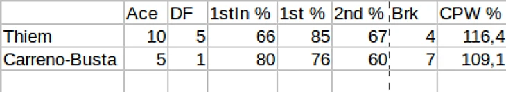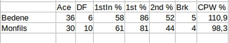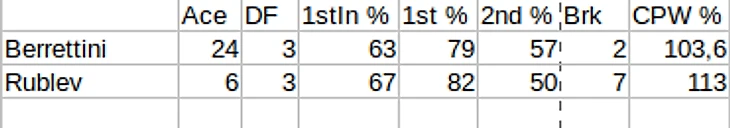 Где 1stln - это % попадания первой, 1st - % выигранных очков на первой, 2nd - на второй, Brk - реализация брейков, CPW - % комбинированных очков, набранных на подаче и приеме.