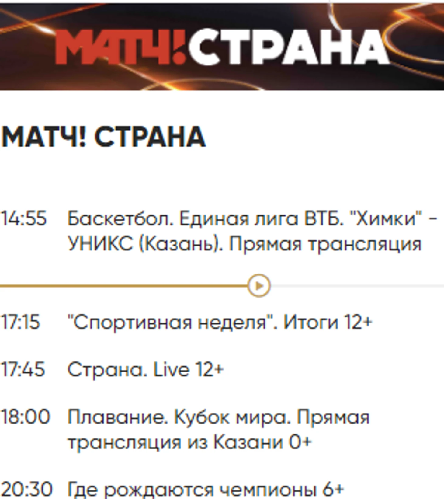 Вот программа канала Матч Страна на актуальный отрезок сегодняшнего дня... В перерыве баскетбола там были новости с Михайловым...