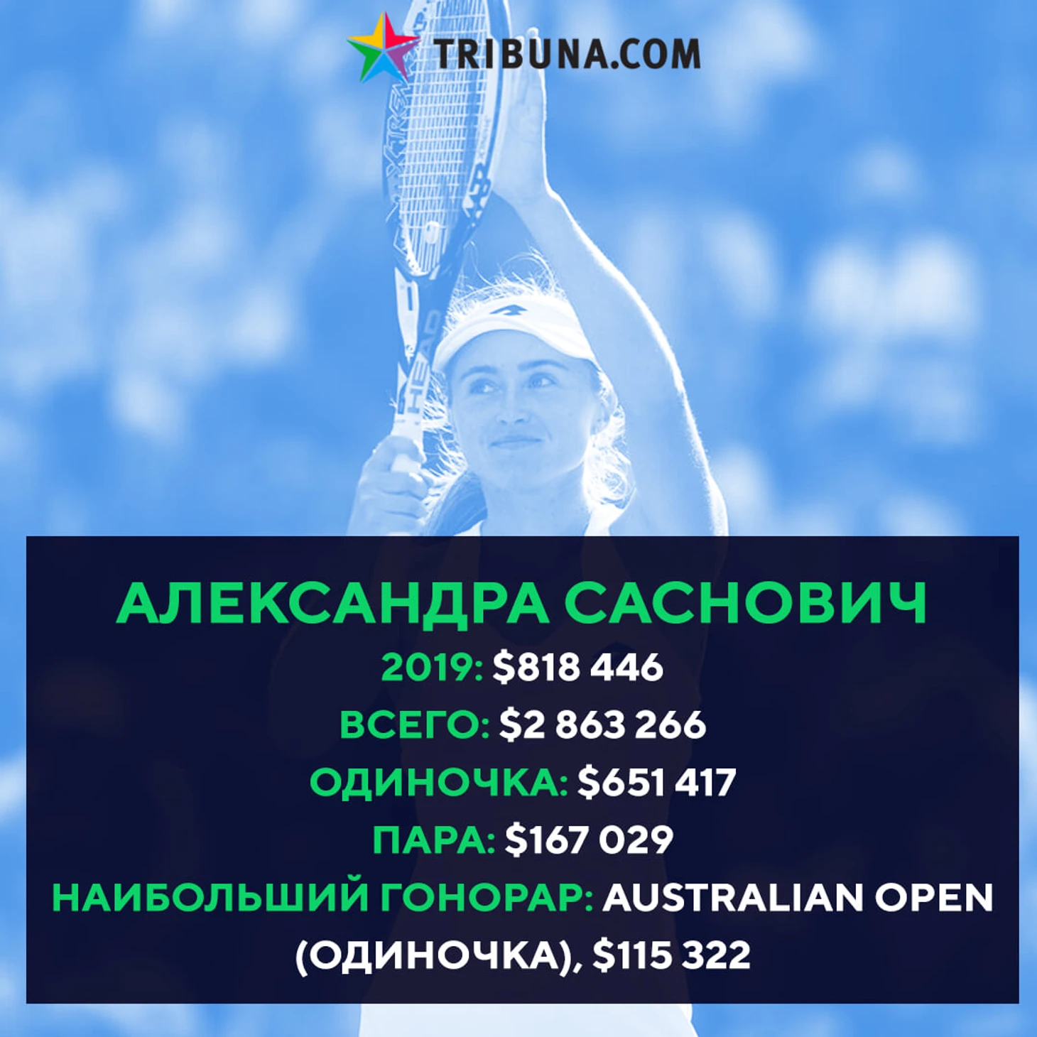 Из большой тройки женского тенниса Беларуси денежный спад произошел только у Александры Саснович. За год минчанка откатилась в рейтинге с 30-го места на 68-е. В последний раз Александра выигрывала два матча подряд только в мае. Лучшим результатом сезона стал выход в полуфинал Брисбена, за который Саснович получила 40 тысяч. Если бы 1/16 финала Australian Open, а вместе с ними и приличные призовые, то заработок в 2019-м получился бы совсем скудным и не сравнимым с прошлогодним миллионом.