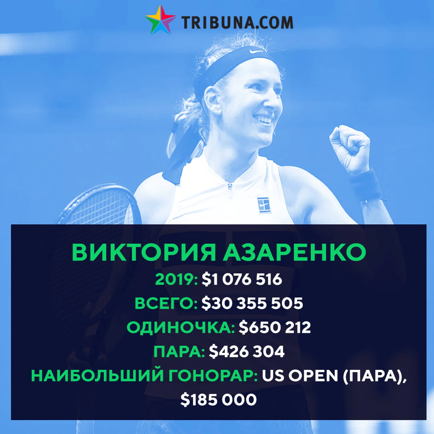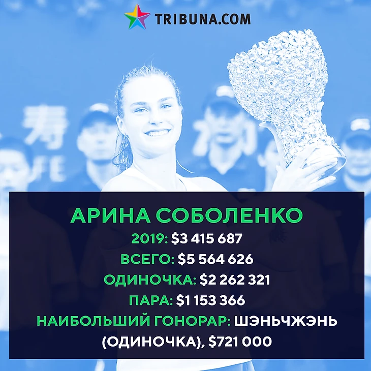 В 2019-м Соболенко заработала практически 3,5 млн долларов. А сколько получилось у Азаренко и Саснович?