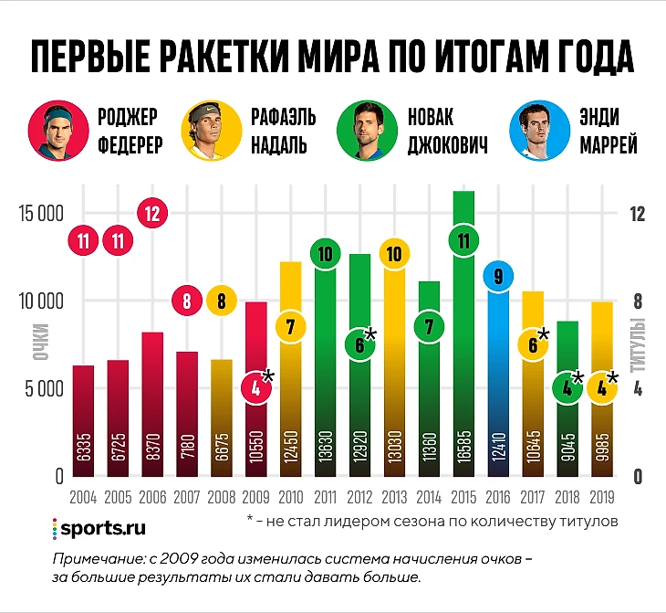 Во-вторых, обрисовывается четкая тенденция: последние три сезона лидеры рейтинга зарабатывают исторические минимумы очков и не выигрывают больше всех титулов. Все потому, что они мало играют, сосредотачиваясь на крупных турнирах.