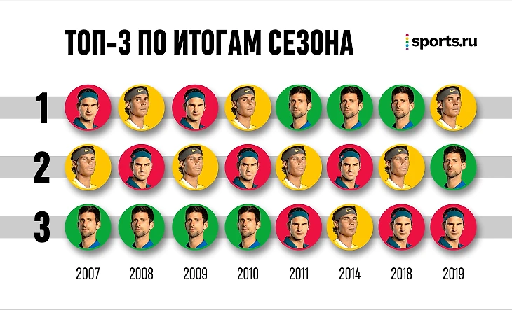 Величие Большой тройки иллюстрируется и другим графиком. Джокович вошел в топ-10 в 2007 году. С тех пор завершилось 13 сезонов, и по итогам восьми из них Роджер, Рафа и Новак в разных комбинациях занимали первые три места в рейтинге.