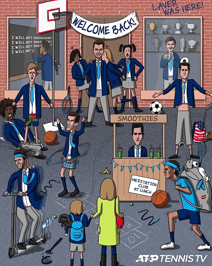• маленький Саша Зверев с мамой и Левиком в школьном дворе в первый учебный день, означающий старт сезона ATP. Там же Новак Джокович продает смузи и предлагает помедитировать в перерыве между уроками, а Григора Димитрова облепили поклонницы: