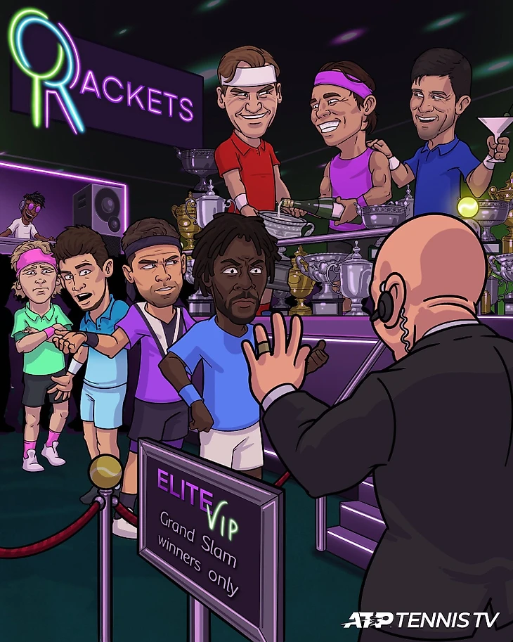 • VIP-лаунж ночного клуба, где Рафаэль Надаль наливает шампанское в кубок Australian Open который держит Роджер Федерер, пока его похлопывает по плечу Новак Джокович, а охранник не пускает к ним Монфиса, Димитрова, Тима и Зверева.