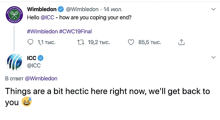 Большая клиентская база и немного сообразительности, например, позволили LiveWire 14 июля 2019-го создать элегантный кроссовер. Когда финал «Уимблдона» наложился на финал Кубка мира по крикету так, что там даже совпали сюжетные линии (Джокович перевел финал на чемпионский тай-брейк тогда же, когда Новая Зеландия и Англия в своем матче начали супер овер), в твиттере произошло это и собрало больше 23 тысяч лайков: