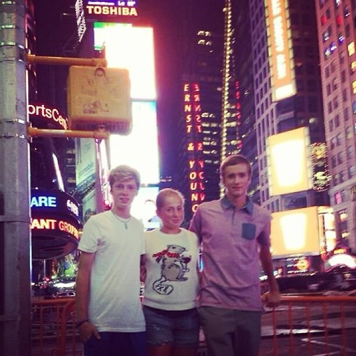 «После ужина мы пошли прогуляться через Таймс-сквер. Было, по-моему, уже позже десяти, так что все магазины были закрыты, и мы пошли в Центральный парк. Но это было неудачной идеей, потому что только мы туда пришли, как заметили каких-то парней, которые, прячась за деревьями, за нами следили. После этого мы вернулись в отель, но все равно было весело».