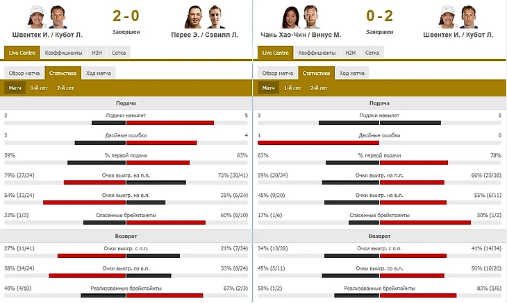 Также очень хорошие цифры по игре на своей подаче, особенно во втором матче. В этой паре опыт и мастерство Кубота играют важную роль. Но и Швентек, практически не имеющая игровой практики в парах, выглядит на корте очень достойно. У юной польки очень хорошая реакция, и умение в игре у сетки - а это важные составляющие парного тенниса.