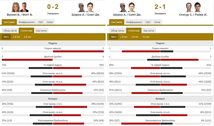 Как мы видим, показатели хорошие и достаточно стабильные. В первую очередь, выделяется высокий % попадания первой подачи, но главное на что стоит обратить внимание - это большое количество очков, выигранных на своей подаче в целом, и на первом мяче в частности. Это говорит о том, что их заготовленные комбинации в подавляющем большинстве случаев уверенно проходят, т.е. мы наблюдаем очень хорошую сыгранность. Еще один показатель, подтверждающий это - большое количество отыгранных брейк-поинтов.