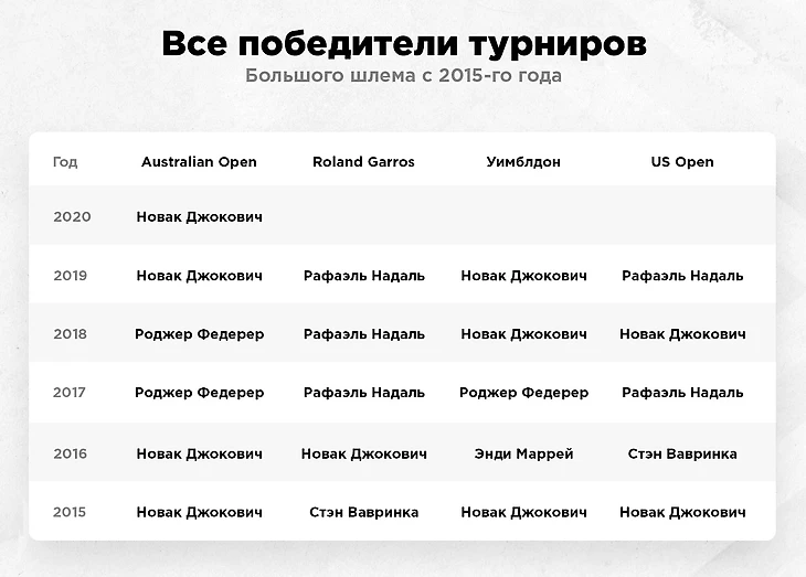 Победы Джоковича, Надаля и в уже меньшей степени Федерера приелись многим поклонникам тенниса. Хочется настоящей конкуренции, а для этого нужен приток свежей крови. Сколько бы мы ни говорили о поколении будущего, пока это только красивые слова и действительно отличный итоговый турнир с шикарной графикой и интересными (пусть и далеко не бесспорными) нововведениями в правилах. А если мы посмотрим на победителей ТБШ на пятилетнем отрезке, то получим довольно безрадостную картину.