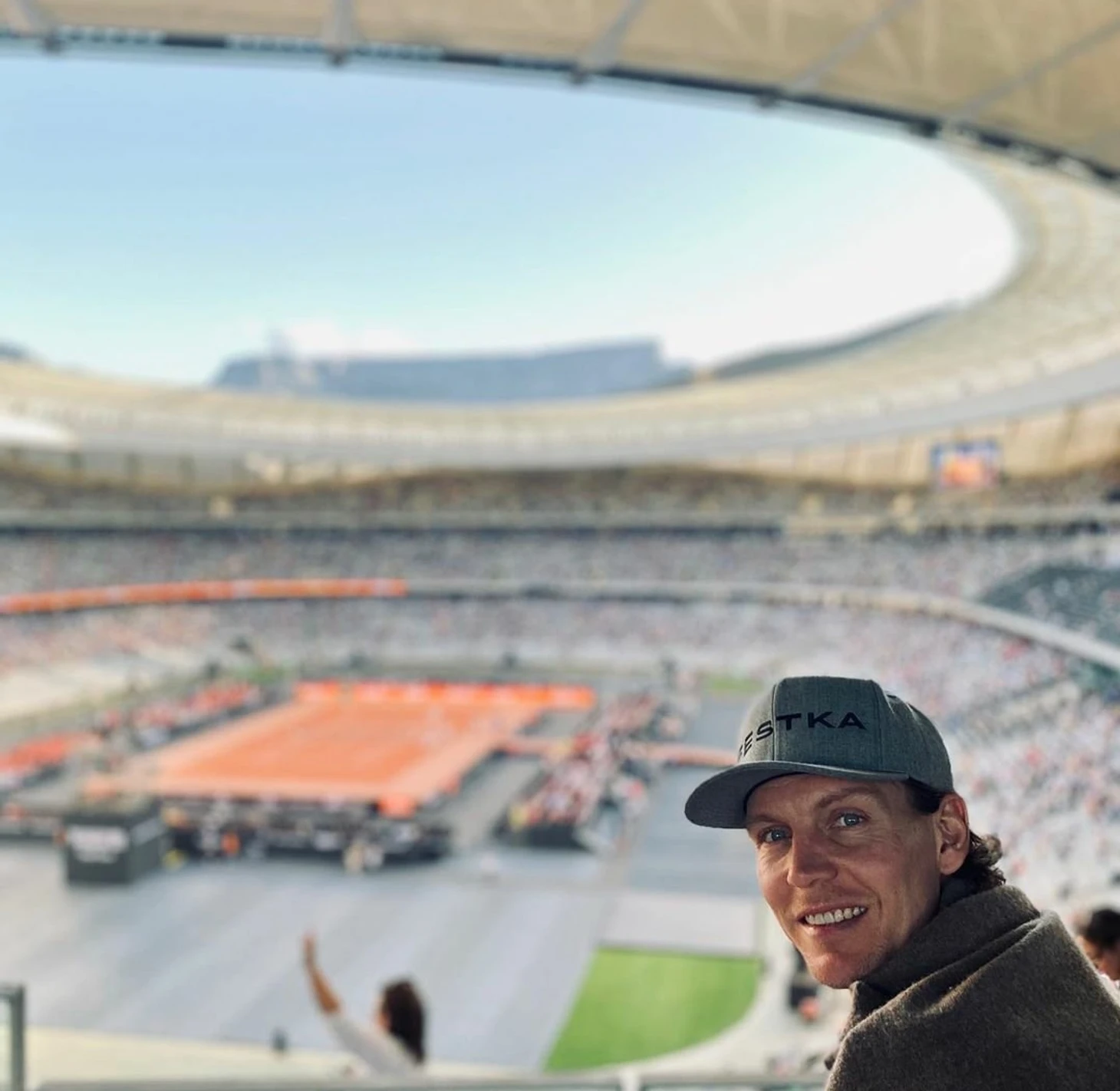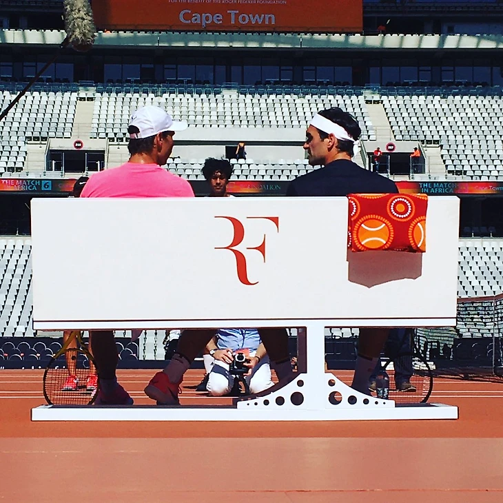 «Привет всем, я в Кейптауне. Только приехал на теннисный корт – точнее, на футбольный стадион. Только посмотрите, как здесь потрясающе. Сам корт оранжевый – для Рафы, чтобы он подумал, что это грунт. Но это хард»