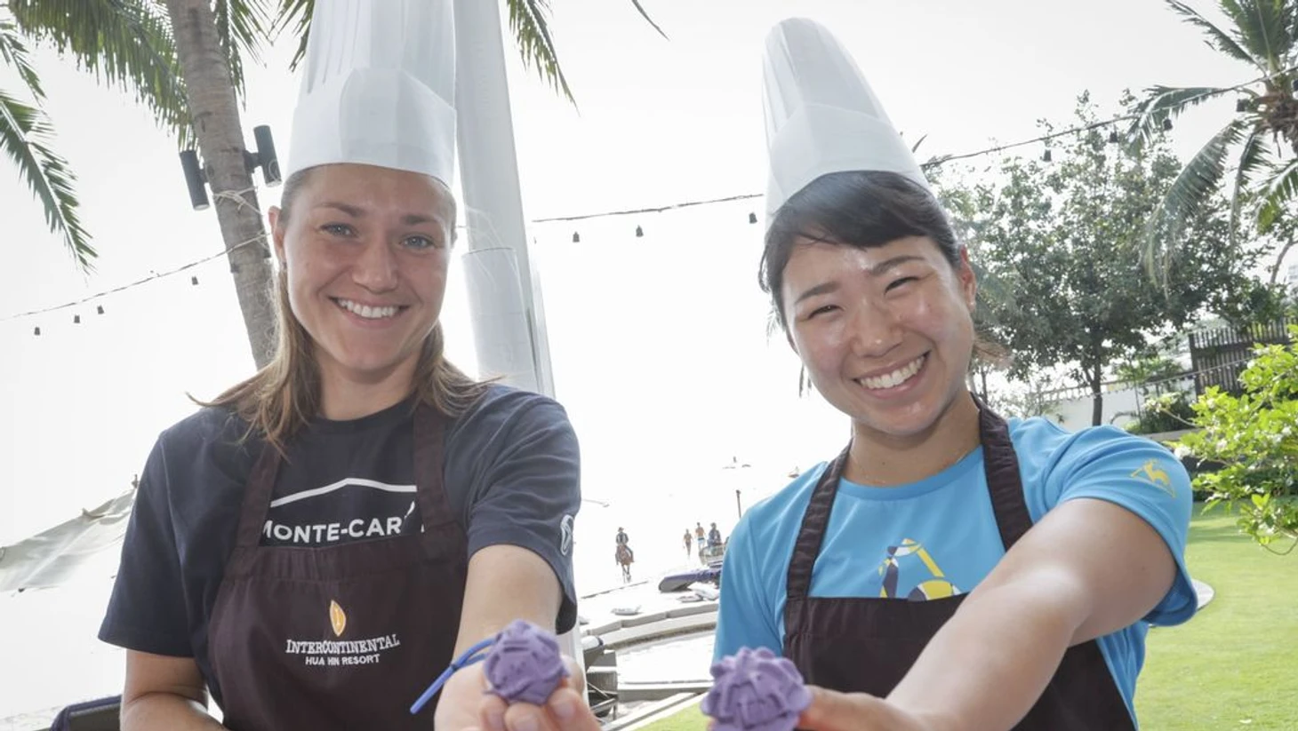 Катерина Бондаренко и Нао Хибино получили урок кулинарного мастер-класса, который продемонстрировал урок по приготовлению необычных пельменей от шеф-повара отеля Intercontinental Resort.