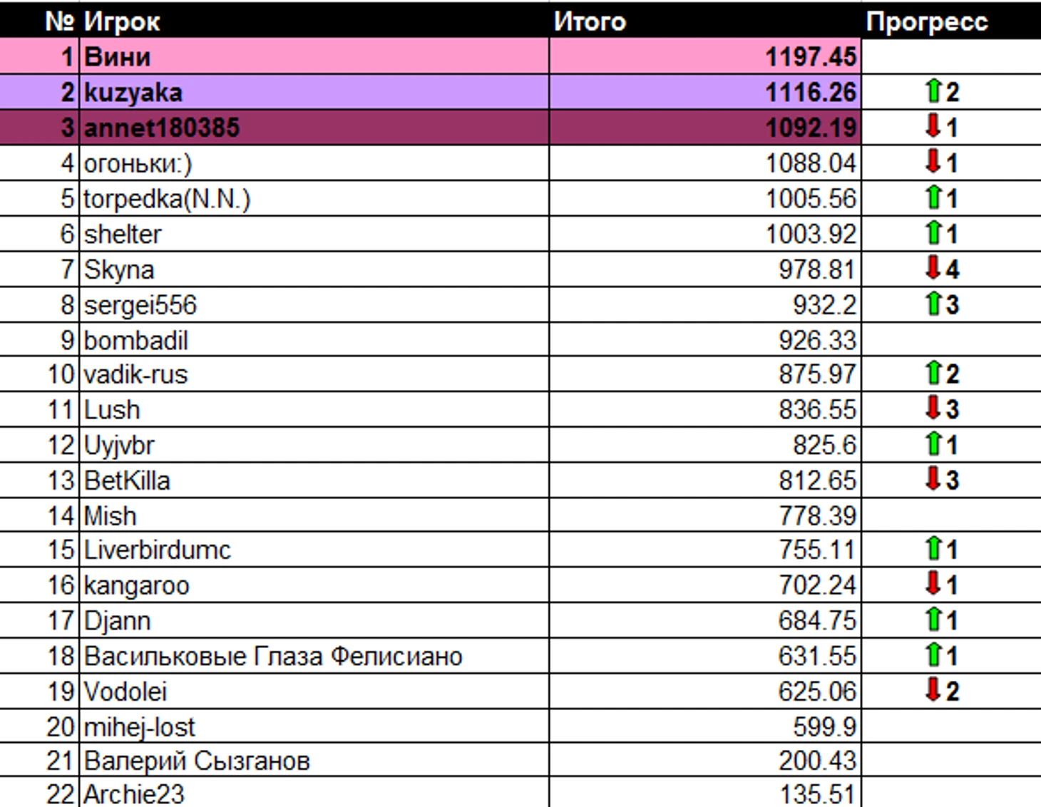 Обратите внимание колонку "Прогресс". Она отображает динамику позиций участников в зачёте в течение этапа. Если ячейка напротив вашего ника не заполнена, значит ваша позиция осталась прежней. Стрелочка вверх соответствует улучшению позиции, стрелочка вниз — ухудшению. Число рядом со стрелочкой соответствует количеству отыгранных/утерянных позиций.