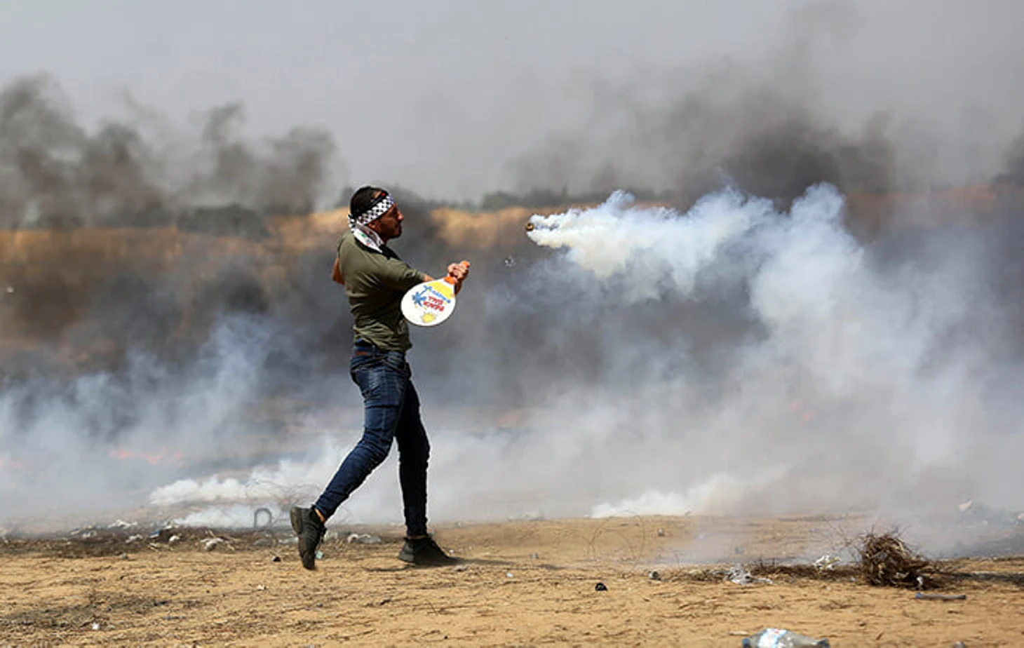 Той же весной вечная геополитическая рана на границе Израиля и Палестины тоже лечилась с помощью ракетки – правда, для пляжного тенниса. На фото палестинский протестующий в бандане почти как у Пэта Кэша отправляет шашку обратно израильским военным.