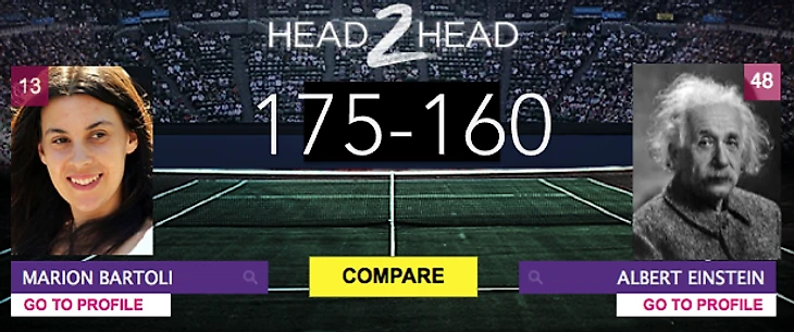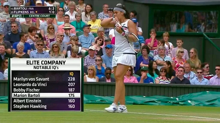 • и конечно, культовый титр из трансляции полуфинала «Уимблдона»-2013 на ESPN, где IQ Бартоли показали рядом с теми же Эйнштейном и Хокингом, а также шахматистом Бобби Фишером (187), Леонардо да Винчи (208) и писательницей Мэрилин вос Савант, занесенной в Книгу рекордов Гиннесса как обладательница самого высокого в мире IQ (228):