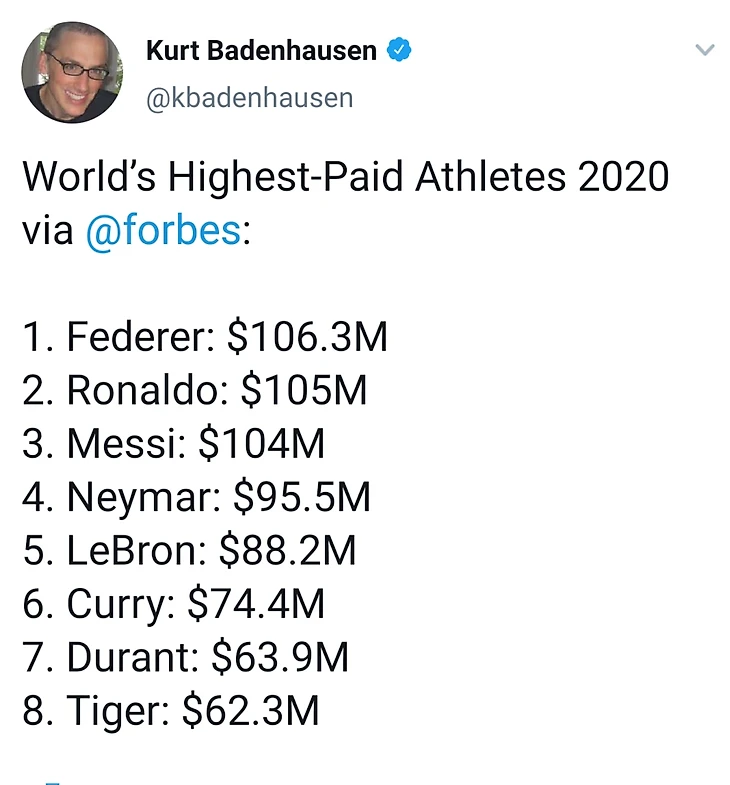 Вчера на сайте FORBES вышел очередной рейтинг доходов спортсменов, в котором произошли существенные изменения по сравнению с 2019г., которые в первую очередь связаны с последствиями от вируса COVID19. После того как Месси и Роналду остались без футбола их зарплата была урезана (примерно на 70%,точных данных нет), об этом факте Месии сообщил в своем инстаграмм, так же не стоит забывать и о бонусах, которые являются существенной статьей дохода футболистов. Взглянув на рейтинг мы видим, что доходы 2-х ведущих футболистов современности по прежнему остаются на звездном уровне. Новым королем стал великий теннисист Роджер Федеррер заработав 106,3 млн $ , такой доход ему обеспечивают помимо основной деятельности 13 спонсорских контрактов, в числе которых такие бренды как :Nike,Credit Suisse,Barilla и Rolex