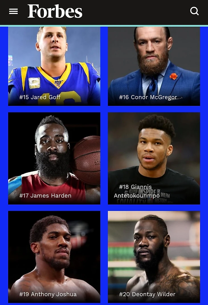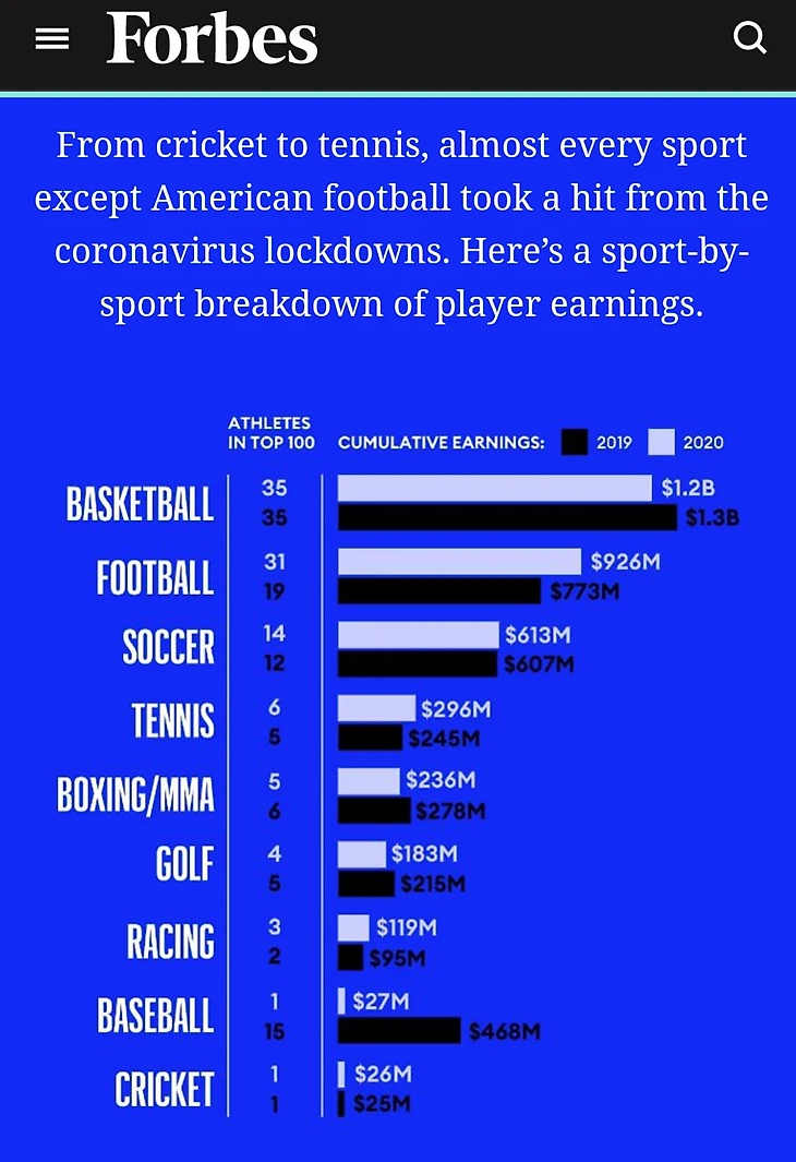 Последствия кризиса отразились и на зарплатах спортсменов из ТОП-100 рейтинга самых высокооплачиваемых спортсменов мира, в который входило 35 игроков НБА с общей зарплатой 1.3 млрд $ в 2019г. , после кризиса зарплатная ведомость этих спортсменов уменьшилась на 100млн $ и сейчас находится на уровне 1.2млрд $ . По сравнению с прошлым годом в рейтинг топ-100 входил 31 игрок из американской футбольной лиги, общий доход которых был 773млн $ , в нынешнем году в рейтинг попали только 19 игроков , но что странно их общая зарплата в 2020году увеличилась до 926млн $. Из топ-100 вылетели 2 футболиста и в этом году их стало 12 , но общая зарплата осталась примерно на том же уровне.Положительную динамику показывают звезды единоборств (бокс и MMA) , в том году в рейтинге их было 5 человек , а в этом уже 6 с общим доходом в 278млн $ (Хабиб Нурмагомедов в рейтинг не попал). Настоящий удар кризиса или вируса COVID19 пришелся на бейсбол, из рейтинга топ-100 вылетели сразу 14 спорстменов , остался лишь один с зарплатой в 27млн $