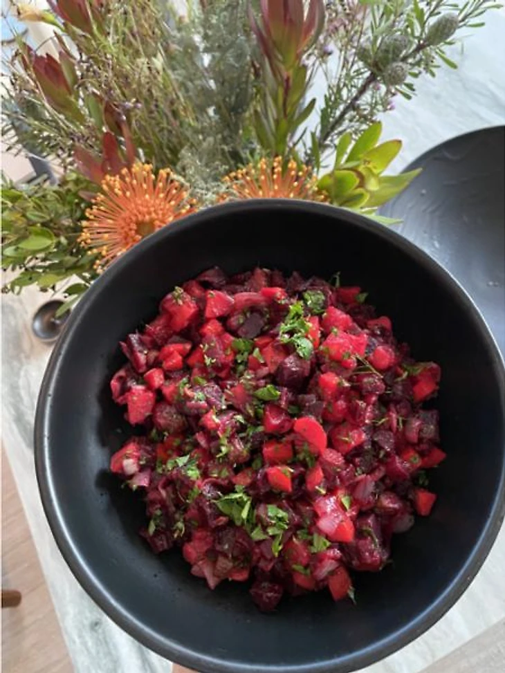 Сначала отварите три очищенные от кожуры свеклы, пока вы не сможете легко проткнуть их ножом - это может занять до часа. Так что, если вы спешите, просто используйте предварительно отваренную свеклу. В отдельной кастрюле сварите три очищенных картофеля и три очищенных моркови, пока они не станут мягкими, но не кашеобразными. Дайте овощам стечь и остыть, прежде чем нарезать их кубиками. Под конец, нарежьте маленькую головку лука и положите все в миску. Добавьте две столовые ложки оливкового масла, немного белого уксуса, немного лимонного сока и свежей рубленой петрушки. Приправить салат по вкусу солью и перцем - и всё в ажуре!