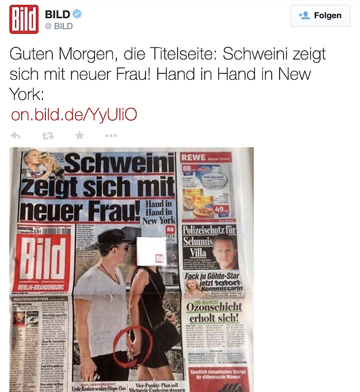Это произошло осенью-2014, когда Иванович впервые за пять лет вернулась в мировую десятку, а Швайнштайгер восстанавливался после победного чемпионата мира. Спортсменов заметили держащимися за руки на прогулке по Нью-Йорку после неудачи Иванович на US Open (во втором круге проиграла Каролине Плишковой, которая через два года дойдет там до финала, а через три станет первой ракеткой мира). На следующий день немецкий Bild вышел с их фотографией на первой полосе, не слишком изящно представив открытие в твиттере: