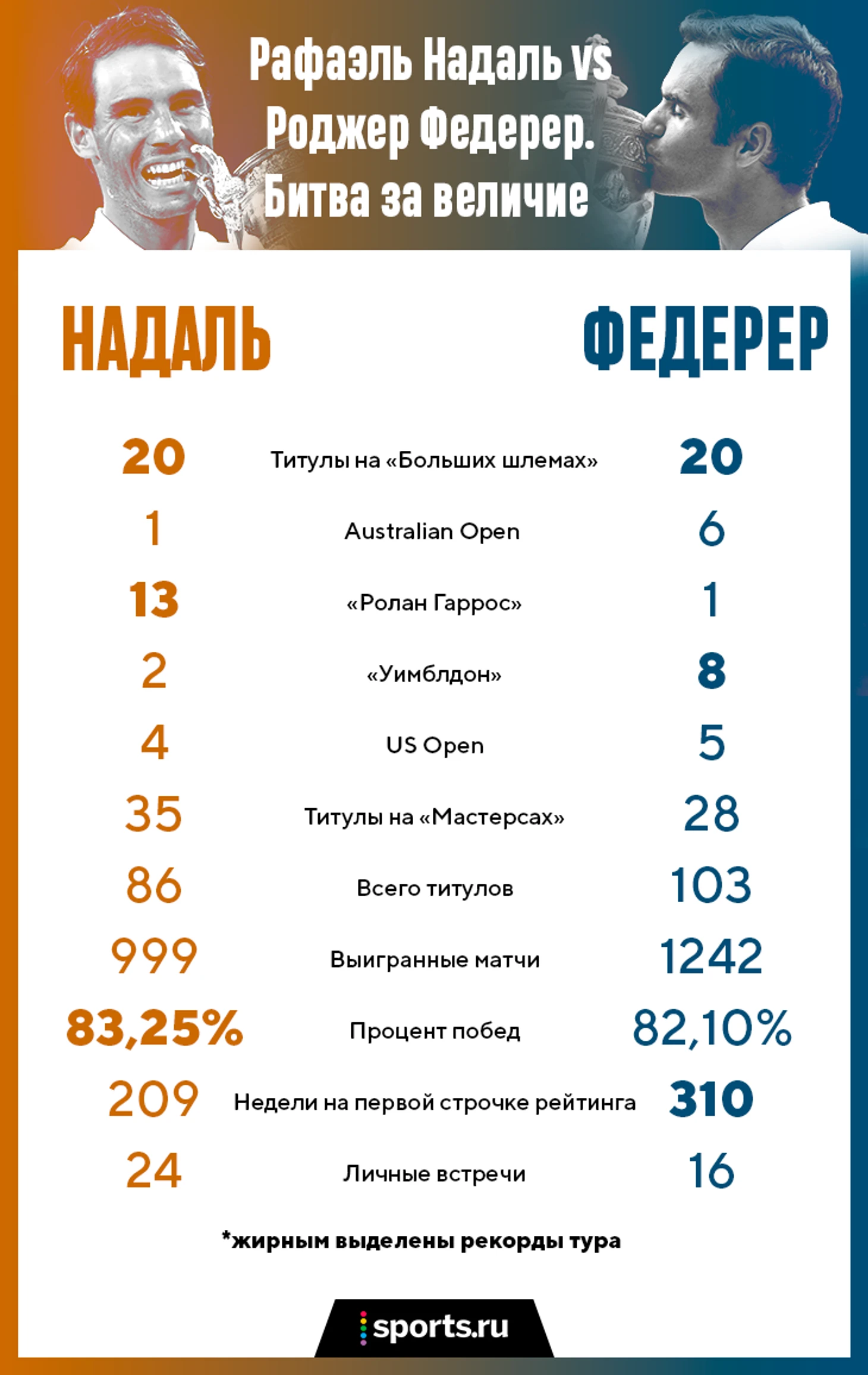 Но раз уж Рафаэль Надаль сравнялся с Роджером Федерером по главному показателю – титулам на «Больших шлемах» (по 20), – интересно сравнить, кто из них добился большего.