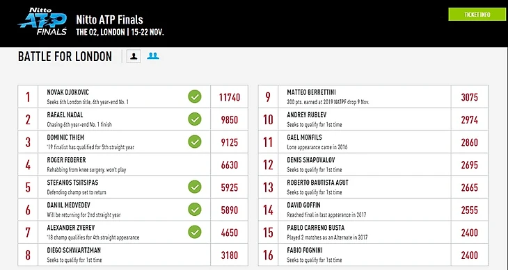Чуть ранее должен был проводиться женский аналог в Шэньчжэне, но он отменен. В начале месяца пошли слухи, что турнир может состояться в другом месте, рассматривались варианты с Прагой и Гавайскими островами, но прожили эти слухи всего один день. Уже 2 октября WTA официально объявила об отмене женского итогового турнира в 2020 году. Также у девушек не состоятся все азиатские турниры, которые осенью всегда являлись основной частью календаря. В Европе под натиском ковида пал Люксембург и московский Кубок Кремля. И в календаре с середины осени числятся лишь два турнира — Острава (15-25 октября) и Линц (9-15 ноября). У мужчин всё гораздо веселее. Помимо азиатских турниров АТР лишилась Москвы, Стокгольма, Базеля и Итогового молодежного. Зато дебютировали в календаре на данном уровне Кельн (дважды), Сардиния и Астана. Также в ноябре пройдут обычно февральские соревнования в Софии. Более привычные сроки сохранили Санкт-Петербург, Вена, Антверпен, Париж и Лондон. Последние наиболее важны, так как являются крупнейшими турнирами данного отрезка. Столица Франции соберет лучших теннисистов планеты в рамках заключительного Мастерса сезона, а на Британские острова пожалует восьмерка лучших игроков планеты. Шесть теннисистов, в соответствии с рейтингом АТР, отбор в Лондон уже прошли. Это Новак Джокович, Рафаэль Надаль, Доминик Тим, Даниил Медведев, Стефанос Циципас и Александр Зверев. Гипотетически там мог бы выступить и Федерер, но он из-за травмы решил досрочно завершить сезон. Таким образом вакантны еще два места, но неудивительно если освободится третье из-за отказа Надаля. Рафа и в обычные годы со скепсисом подходил к концовке, порой организм просто не выдерживал. Сейчас же ему пришлось выложиться на максимум не в мае, а уже в октябре, при том, что он до последнего говорил о том, что теннисный сезон в этом году нельзя возобновлять. Так выглядит таблица «Дорога в Лондон» из топ-16 теннисистов планеты.