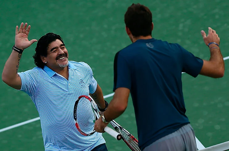 Нежный Гигант пересекся с Марадоной, например, в 2013-м. Диего тогда сотрудничал с властями Дубая и в феврале регулярно ходил на теннис, а перед стартом мужского турнира вообще заявил: «На следующей неделе я сам буду тренировать дель Потро. Попрошу Франко Давина подвинуться. Диего станет тренером дель Потро».