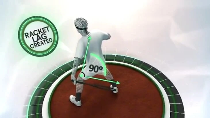 • В задней точке замаха угол между головкой ракетки и рукой Надаля составляет 90 градусов. Это помогает мощно ее разогнать до контакта с мячом.