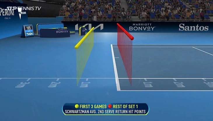 Следующие три гейма – камбэк Шварцмана, организованный за счет дополнительной агрессии. Отличная иллюстрация – его позиция на приеме второй подачи. Желтые мячики – это первые три гейма, красные – остаток первого сета.
